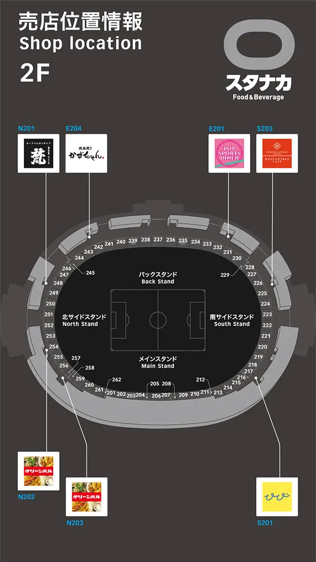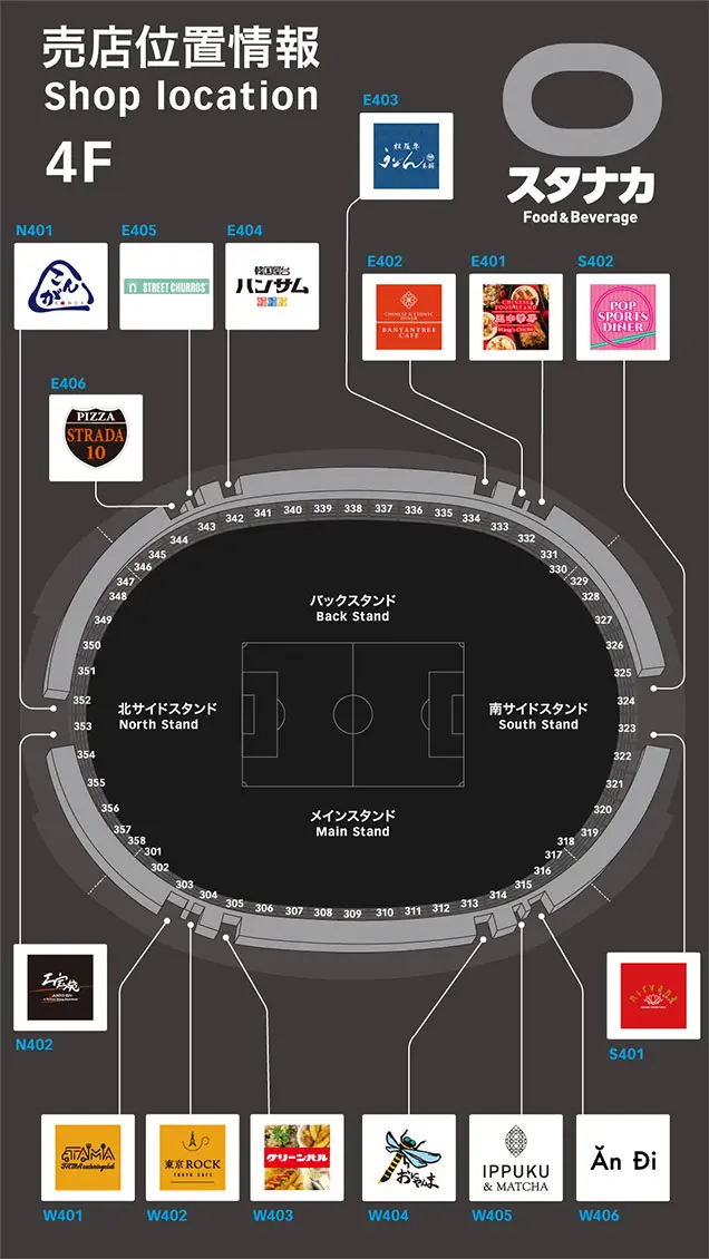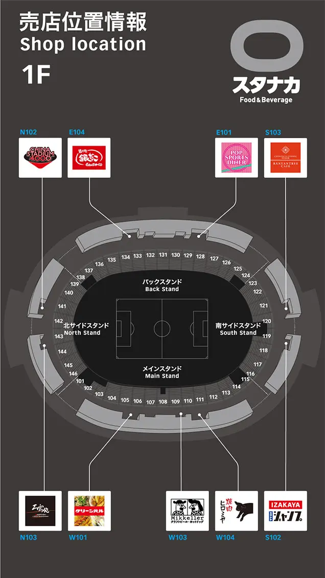 3D場内マップで、入場ゲートや座席ブロックから近い設備や飲食店舗などをご案内します。